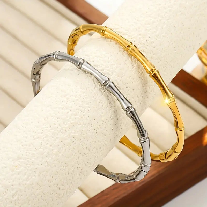 Minimalist with an edge. These bamboo-inspired bangles take the classic stack and give it a sculptural twist—sleek, textured, and impossibly chic whether worn solo or in layers.
